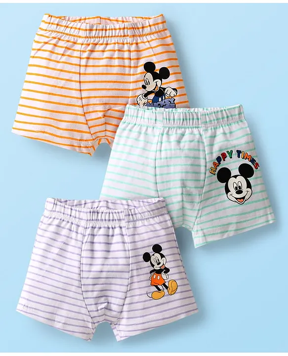 This pack of three cotton trunks is designed to be comfortable and appealing for young children, particularly fans of Disney’s Mickey Mouse. The 100% cotton material ensures breathability and softness, while the elasticated waistbands provide a secure fit. The distinct color themes (orange, light green, purple) combined with the playful Mickey Mouse & Family graphics make these undergarments visually engaging and fun for kids. The striped patterns add a classic touch. They are practical and charming essentials for a child’s wardrobe.