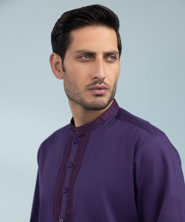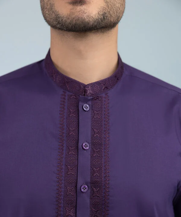 Details:Band Around the Placket Front Panel, Dyed Embroidered Back Panel, Band Neckline, Cuff Sleeves, Standard Length