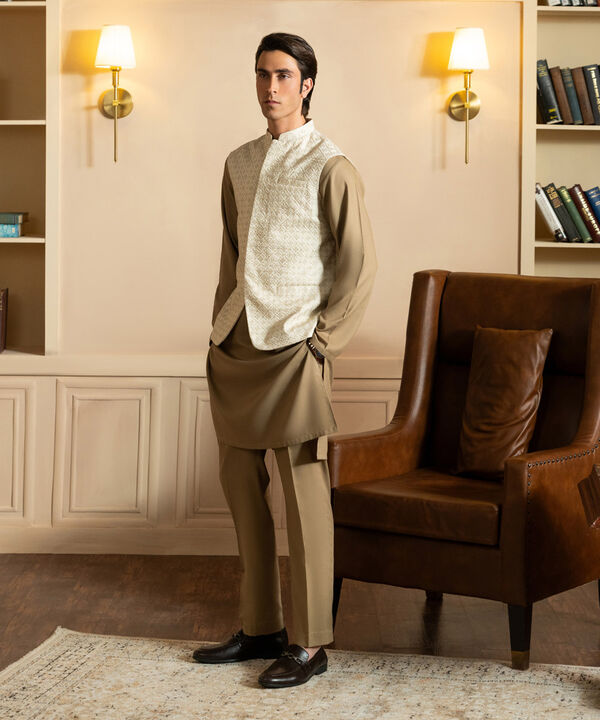 Make a dapper statement in our embroidered beige cotton schiffli waistcoat.