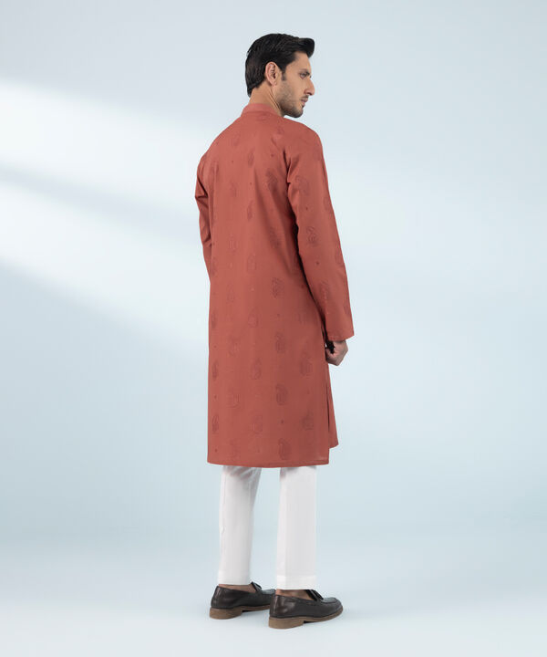 Make a dapper statement in our rust, embroidered schiffli cotton kurta.