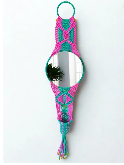 The overall impression is a handcrafted, artistic piece that combines the functionality of a mirror with the decorative appeal of macrame. Its bright colors and bohemian style make it a distinctive accent for a wall, suitable for eclectic, boho-chic, or casual living spaces.