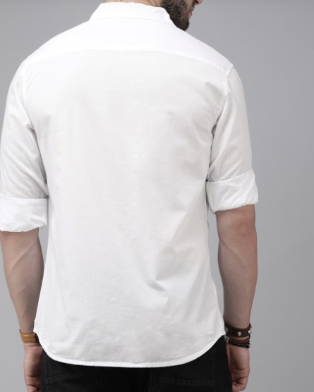 White solid opaque Casual shirt ,has a spread collar, button placket, 1 patch pocket, long regular sleeves, curved hem