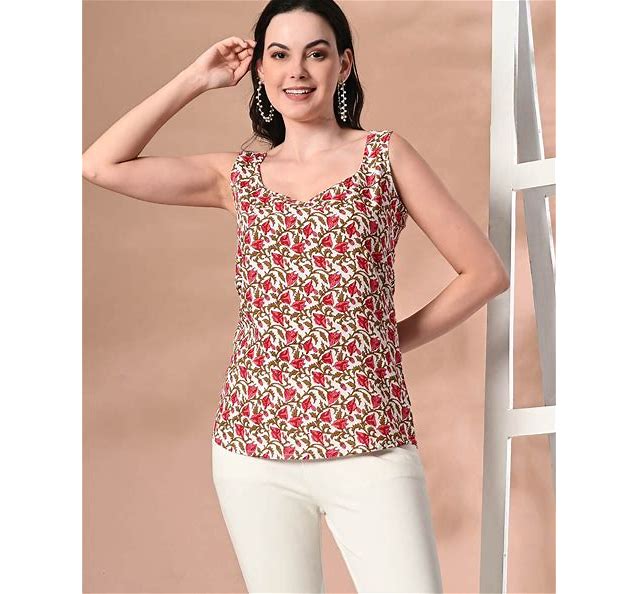 The fabric seems to be a comfortable, breathable material, possibly cotton, rayon, or a blend, suitable for warmer weather given its sleeveless design. The top is paired with light-colored, possibly off-white or cream, trousers, which allows the vibrant print of the top to be the focal point of the outfit. The overall impression is cheerful, fresh, and perfect for a casual daytime look.