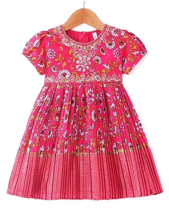 Woven Short Sleeves Floral Printed & Embroidered Pleated Ethnic Dress – Dark Pink